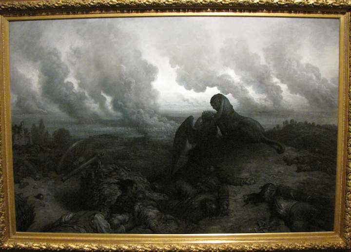 The Enigma (1871) by Gustave Dore weaving together scenes from the Franco Prussian War (1870-1871) in Paris and mythology.